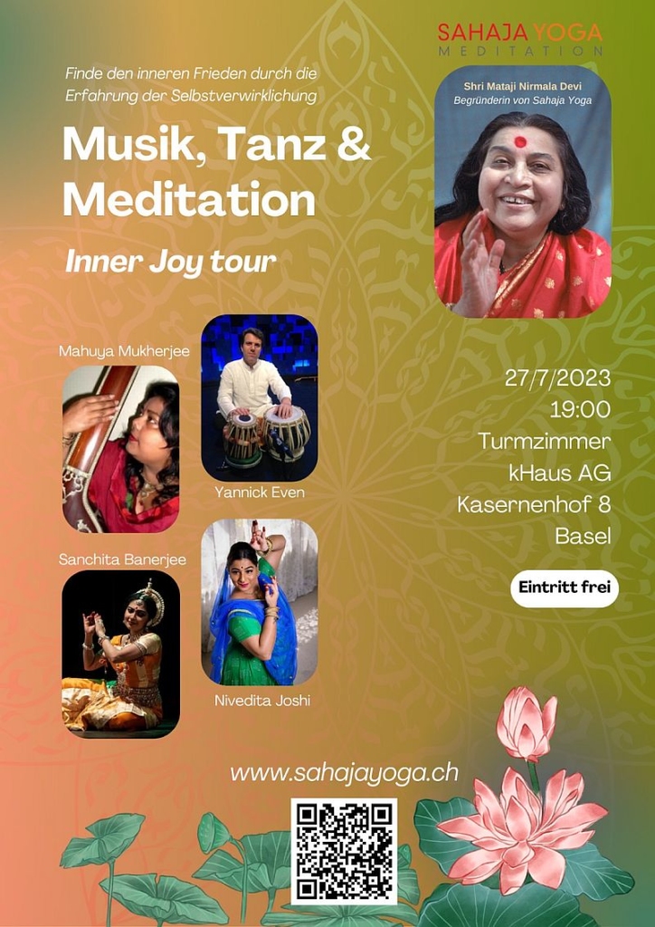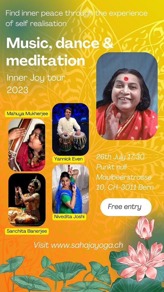 Der Höhepunkt des Abends ist eine ruhige Meditationssitzung mit den Techniken des Sahaja Yoga, das von Shri Mataji Nirmala Devi begründet wurde. Sie werden die Gelegenheit haben, den Zustand des gedankenlosen Bewusstseins und der inneren Glückseligkeit zu erleben.