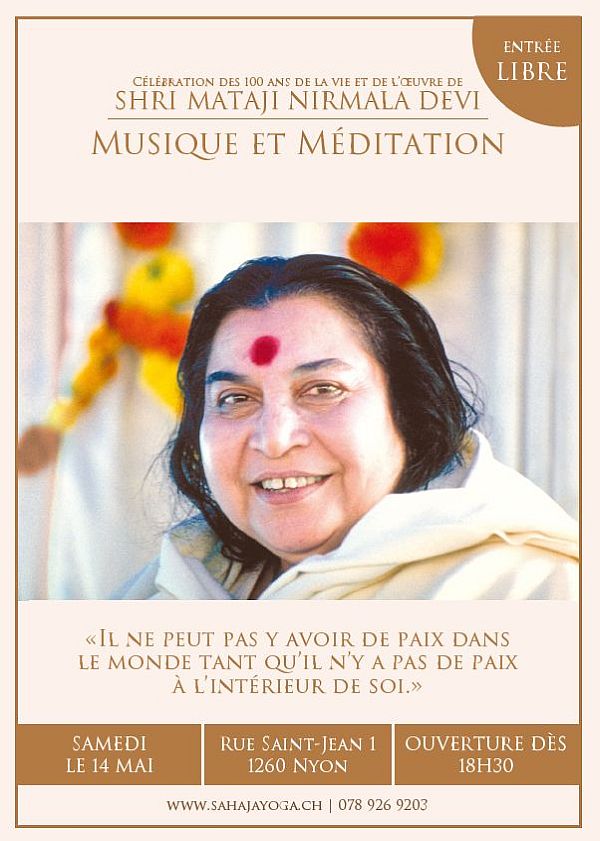 Conference, News, Nyon Music and meditation evening in Nyon – Saturday May 14, 2022 1017Views ShareTwitterFacebookGoogle+ The Sahaja Yoga association invites you on Saturday May 14 at 6:30 p.m. to an evening dedicated to meditation and music on the occasion of the celebration of 100 years of the life and work of Shri Mataji Nirmala Devi!Rue Saint-Jean 1 – 1260 NyonFree admission
