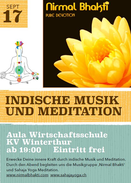 Conferenza, Musica Musica indiana e meditazione a Winterthur – 17 settembre 22 769Views ShareTwitterFacebookGoogle+ Risvegliate il vostro potere interiore attraverso la musica indiana e la meditazione!Vi invitiamo sabato 17 settembre a Winterthur alle 19.00 per una serata “Musica e meditazione” con il gruppo ‘Nirmal Bhakti’.Indirizzo: Aula WirtschaftsschuleKV WinterthurIngresso libero