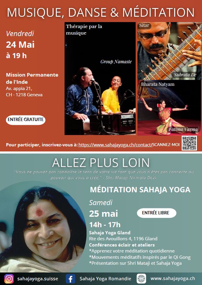 Sahaja Yoga et la Mission Permanente de l’Inde vous invite à une soirée musique, danse et méditation le 24 mai à Genève.
